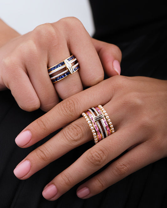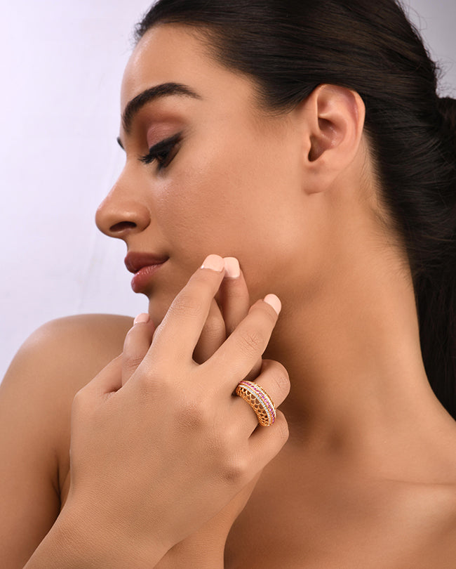 The Jodhpur collection draws on the intricate jaalis that decorate Mehrangarh Fort, one of the largest and most formidable forts in India. The color stones and diamond ring retains an architectural quality to it with a dome-like effect flanked by a repetitive latticed design The precision and intricacy of the gold work is an ode to the architectural magnificence and detailed handwork achieved in the fort, particularly in the jaalis.